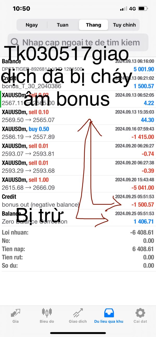 ae nhà đầu tư nên né sàn này ra nhé và tẩy chay nó đi nó khốn nạn vô cùng tkmtt4 030517 nạp 5k bonus30%mình giao dịch bị cháy và âm bonus mình tạo tkmt4 031868 khác rồi nạp vào để giao dịch gỡ lại chưa kịp giao dịch thì nó lại khấu trừ tiền âm bonus của tk kia của mình .mình thấy vô lý đã khiếu lại thì nó bảo đánh gian lận nó trừ luôn mình có hình ảnh để các bạn xem nó khốn nạn không