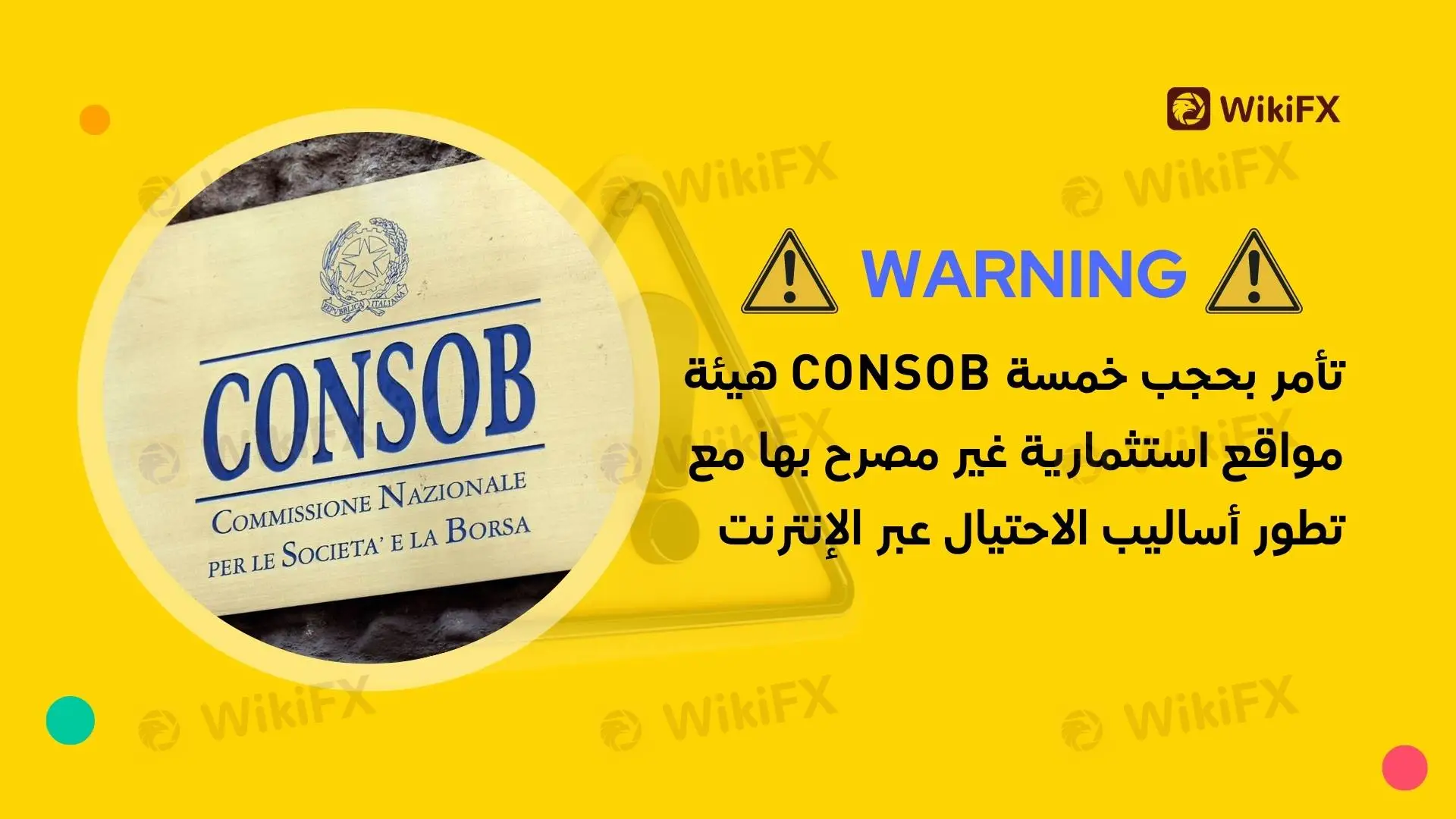 أمرت الهيئة الوطنية الإيطالية للشركات والبورصة (CONSOB) مزوّدي خدمات الإنترنت بحجب الوصول إلى خمسة مواقع إلكترونية إضافية تبيّن أنها تقدم خدمات استثمارية دون الحصول على الترخيص اللازم.