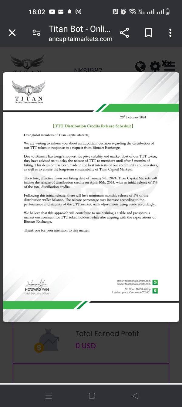 Subject: Complaint Regarding Withdrawal Restrictions at Titan Capital Markets Dear team, I am writing to express my deep dissatisfaction with the current withdrawal restrictions imposed by Titan Capital Markets. At the time of my investment, it was clearly promised that I would have full access to withdraw funds from my wallet whenever needed. However, I have recently encountered significant obstacles in attempting to make withdrawals, which directly contradicts the assurances provided during the investment process. This unexpected and unjust limitation on withdrawal capabilities is not only frustrating but also raises serious concerns about the transparency and reliability of Titan Capital Markets. As an investor, I rely on the integrity of the company to fulfill its commitments and uphold its promises. The inability to access my funds in a timely manner not only disrupts my financial plans but also erodes trust in the organization. I urge Titan Capital Markets to immediately address this issue and honor the original agreement by removing any impediments to withdrawals from wallets. Failure to rectify this situation promptly will force me to consider taking further action to protect my interests and seek restitution for any losses incurred due to these unjustified restrictions. I expect a prompt response and resolution to this matter. Sincerely, Neethu k sunny