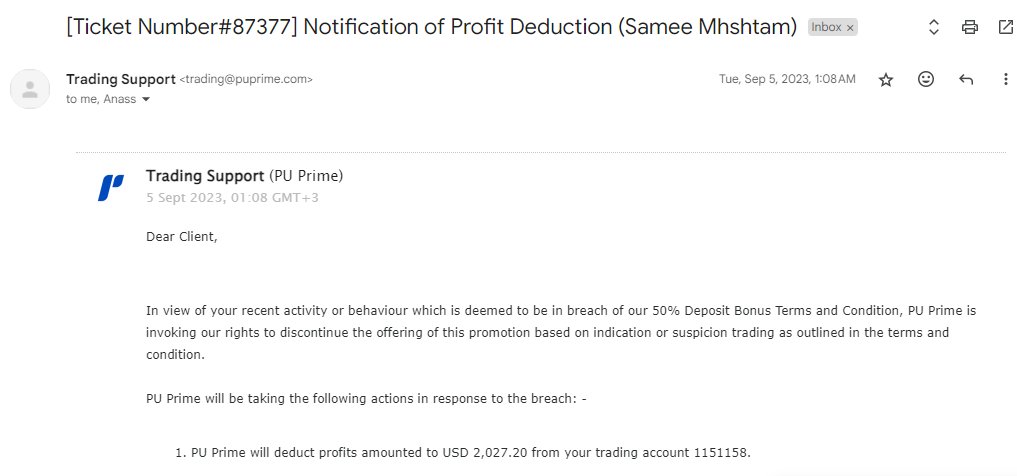 Name: Samee Mhshtamemail: sameemhshtam@gmail.comPuprime mt4 account no: 1151158Deposit Fund: 1000 usdtpuprime manager email: Anass.Berdaa@puprime.comI have deposited my fund for the first time with PuPrime on 20-06-2023. and when i start trades in the start i have lost my half of investment and after that in more trades i earn profit and when i submitted withdrawal request they remove my deposit money and profit both from my account without any reason. they dont have any right to remove money from client's account.when i was losing my fund there was no any issue but when i earned profit and submitted a withdrawal request then they got pain and they removed all of my fund and only 343$ left and other 2027$ they removed from my account.LOLthey are scamming people on the name of bonus offer, they are adding bonus to clients account with there deposit and when client is earning profit they are removing all money from clients account. thats all there strategy. i have sent them many mails but they are not afraid of any one and they are scamming openly.i am sending you screenshot too. kindly check and support me.--SCAM PUPRIME--SCAM PUPRIME--SCAM PUPRIME--SCAM PUPRIME--