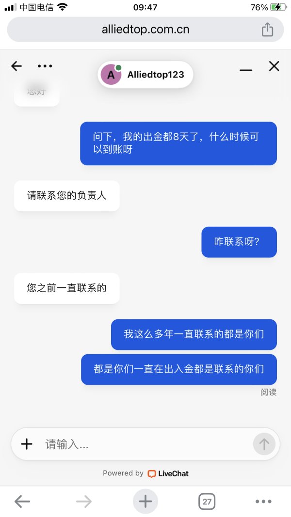 63万资金无法出金,目前已经20天了,前几天是咨询在线客服,一直让我联系我的对接人,可是我对接人是信息不回,电话不接,现在干脆官网直接关闭了在线聊天窗口,全部失联
