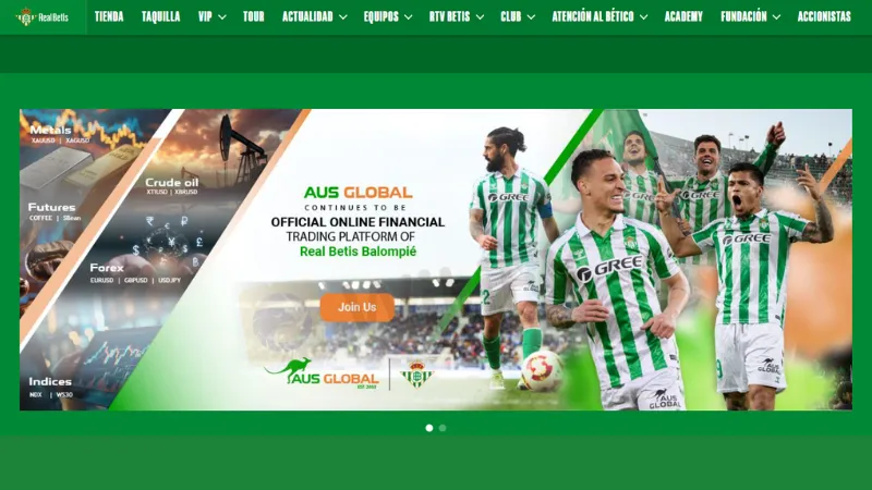 AUS GLOBAL once again appears on the official website of La Liga giant Real Betis, prominently featured in the rolling Banner, showcasing the strong partnership between the two parties and AUS GLOBALs leading position in the global financial trading market. This not only stands as a testament to their deep collaboration but also marks another milestone for AUS GLOBAL on the international stage.