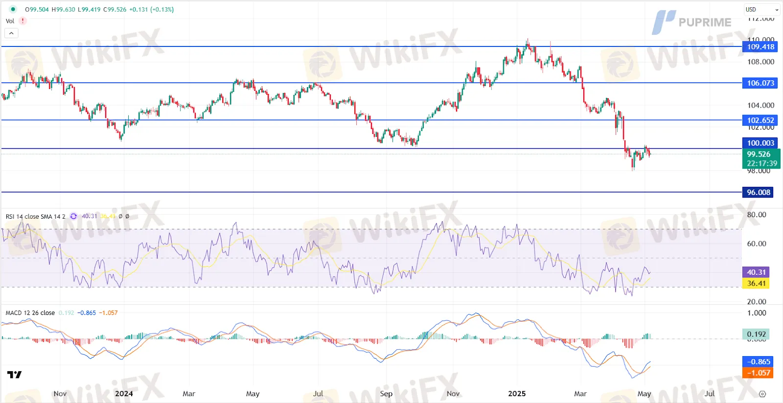 The Dollar Index is trading lower following retracement from the resistance level. MACD has illustrated diminishing bullish momentum, while RSI is at 40, suggesting the index might extend its losses since the RSI stays below the midline.