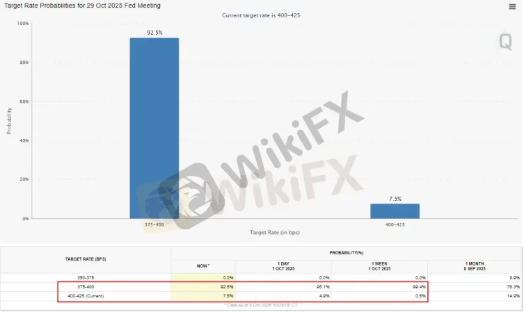 According to CME FedWatch, the probability of a November cut remains high at 92.5%, but down from 99.1% a week ago, while December cut probabilities also decreased — suggesting expectations have cooled slightly.