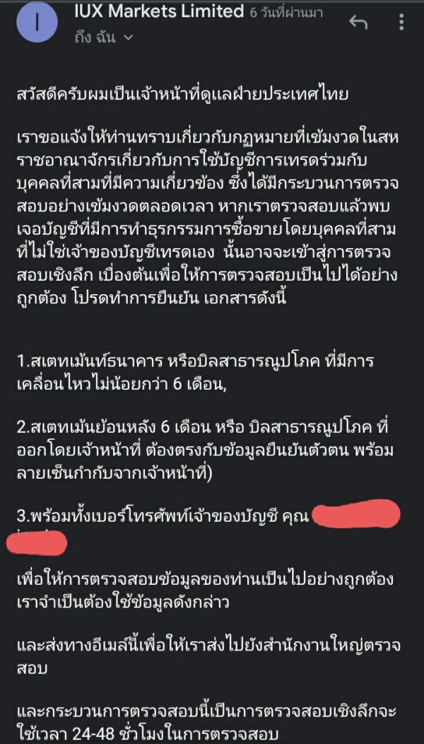 ซึ่งก่อนหน้านี้ก็ฝากและถอนเงินมาสักพักแล้ว แต่ครั้งนี้สั่งถอนเงินไปแล้วทางโบรคก็เมล์มาเพื่อให้ส่งเอกสารยืนยันซึ่งทางเราก็ส่งไป ตั้งแต่วันที่ 28/09/65 จนถึงตอนนี้ 03/10/65ทางโบรคก็ยังไม่อนุมัติก่อนถอนเงินเลยคะ ซึ่งเขาอ้างว่าเราใช้ IP กับบุคคลที่สาม ซึ่งโทรศัพท์ของเราแทบจะไม่ได้ต่อ Wifi เลยเพราะส่วนมากจะใช้ internet sim เพราะกลัวเรื่องมิจฉาชีพต่างๆเพราะในเครื่องเราก็ติดตั้งแอฟ Banking ธนาคารต่างๆไว้ด้วย