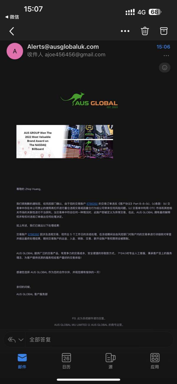 澳汇环球(AUS GLOBAL) 前身澳汇(AUS Forex)平台还是以前那个老平台,老模式,客户只要是赚钱了无理由降杠杆,或者给你账户装一个插件,延迟滑点,手段层出不穷,所以请广大交易者们,代理们,擦亮双眼,如果你在此平台有被恶意卡出金,有恶意降杠杆,有故意拉大你点差导致你爆仓的,请联系我,我们没有打算追回这个钱,但是我们让所有参与到澳汇的工作人员,不管是销售还是客服,还是任何营销人员,让他们付出代价。本人在澳汇平台6月9号入金10000美金,6月23号周五晚上交易,一直到26号周一,周二盈利有超过63000美金,当时一直在做空美日,刚好那天抓住机会了,不是我多么会交易,完全就是不停扛亏损外加运气导致的,第二,直接后台发邮件说违规交易,所有的交易时间以及交易手数都在下图,并且连本金都扣除了,可以定义为杀猪盘,。