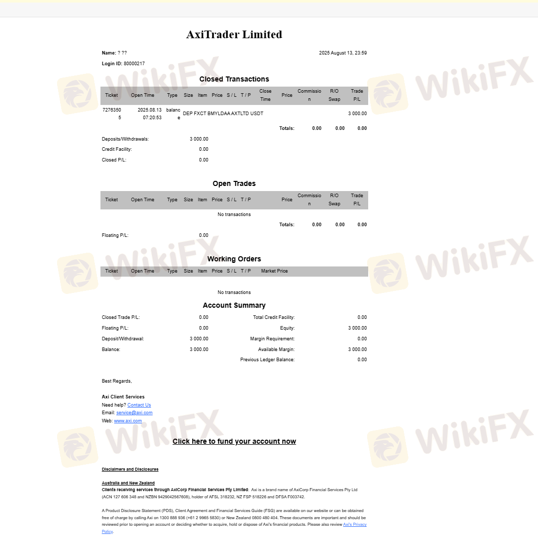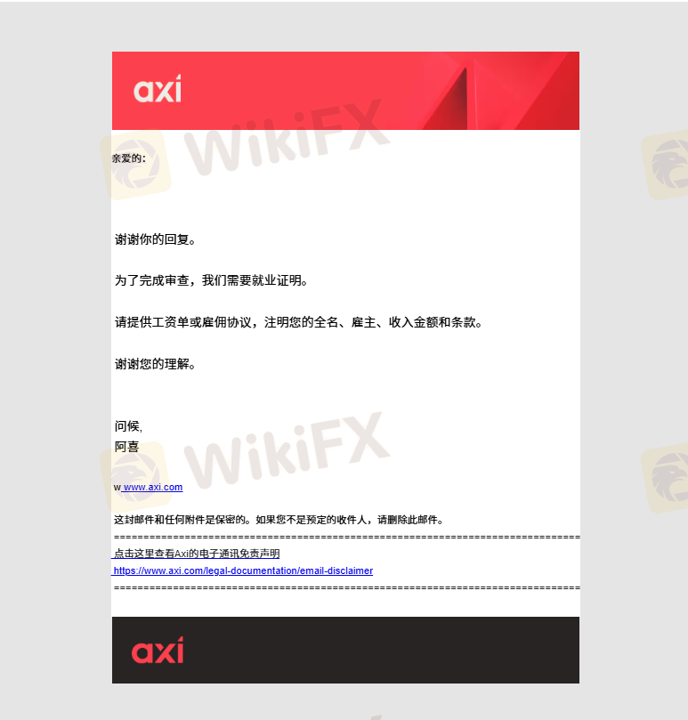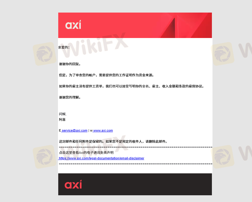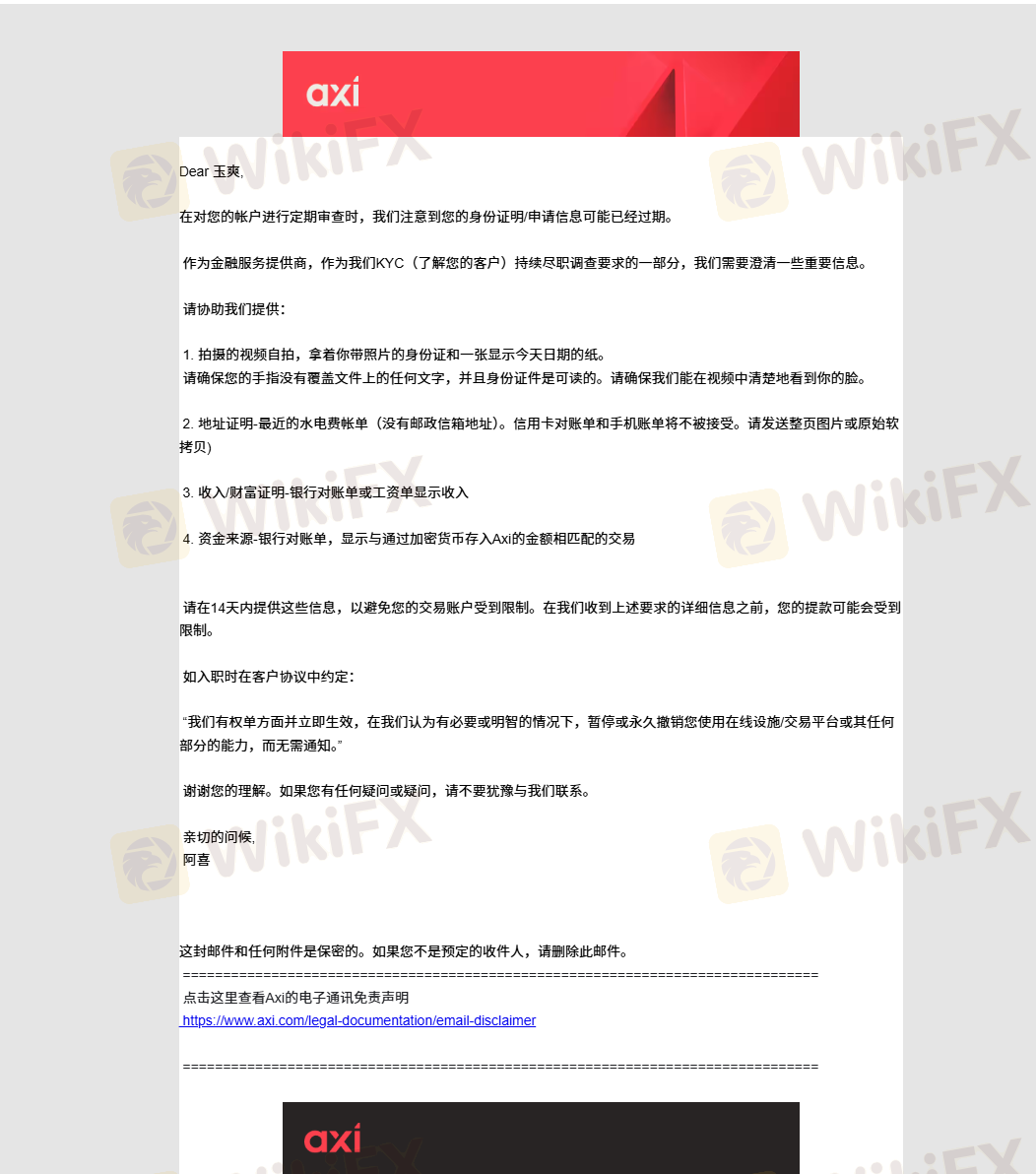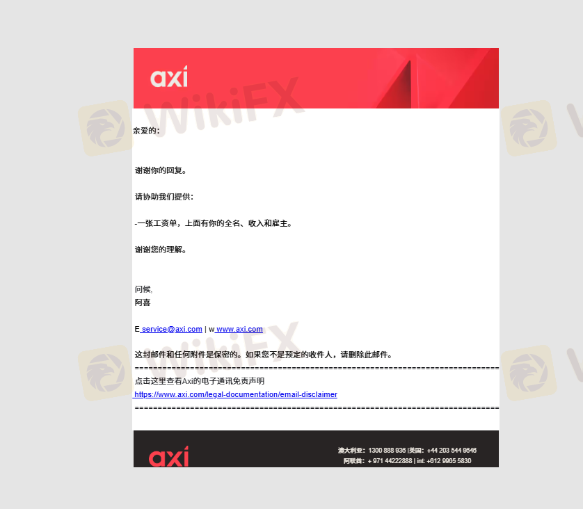 关于Axi外汇平台拒绝出金的投诉 我于近期在 Axi外汇 平台开立账户,MT4账号为 80000217,并入金 3000美金。然而,当我于 2025年8月14日 提交出金申请时,平台却百般刁难,至今拒绝将我的资金转出。 具体情况如下: 1.2025年8月15号,收到平台第一封邮件,要求我提供银行流水和手持身份证件的视频,我很快按要求提交。 2.2025年8月26号,收到平台第二封邮件,又要求提供工资单,我明确回复没有工资单。 3.2025年8月27日,收到平台第三封邮件,他们又要求提供雇佣协议等不合理的材料。 我已清楚说明,我的入金资金为个人多年积蓄,并非工资收入。但平台仍然执意刁难,反复提出不合理甚至根本不存在的要求,明显是在寻找借口, 实际目的就是私吞客户资金。 在与平台的来回沟通拉锯中,我身心俱疲。基于以上情况,我决定曝光该平台的恶劣行为。 在此提醒广大投资者:Axi外汇是一个黑平台,请大家不要上当受骗! (以下附上我与平台的往来邮件截图为证,以及我的入金凭证)
