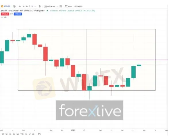 Note also that the BTCUSD key price level of 50k is the middle of the range of the weekly chart, whereby its high is the all time high (ATH) of 69k reached in Nov 2021 and the lowest open of any weekly candle since.