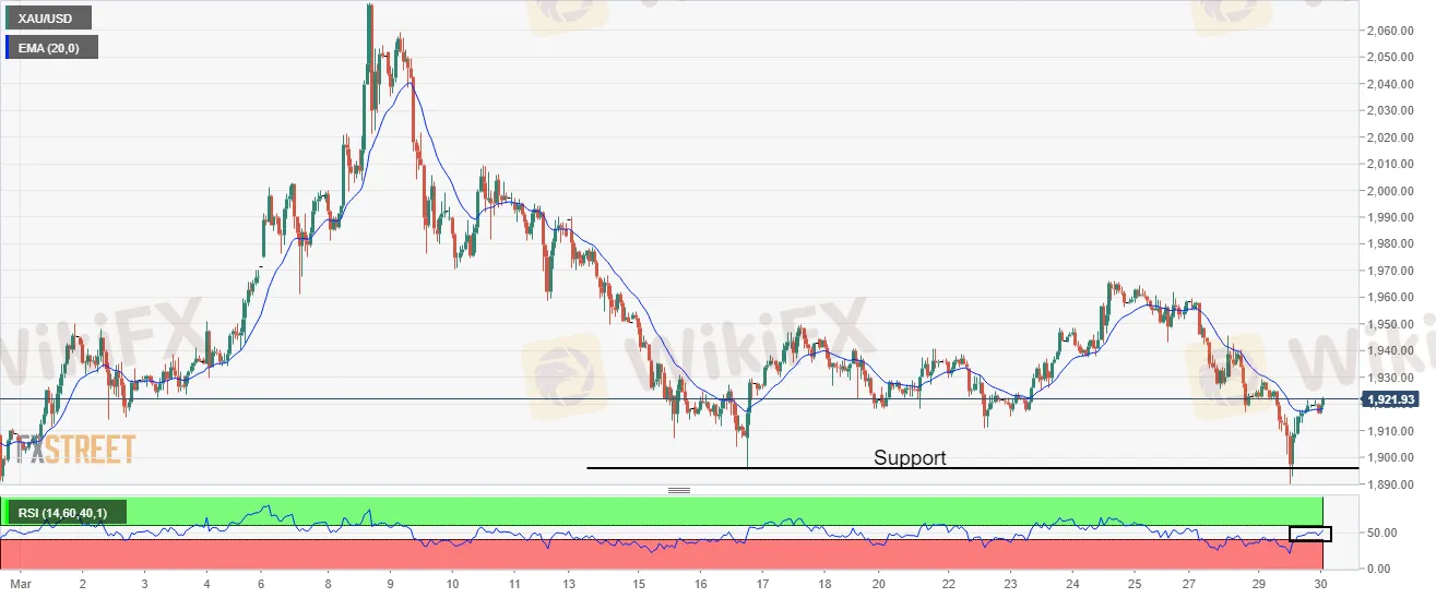 On the hourly scale, XAU/USD has sensed responsive buying after the re-test near March 16 low at $1,895.15. The precious metal has overstepped the 20-period Exponential Moving Average (EMA). The Relative Strength Index (RSI) (14) has shifted into a 40.00-60.00 range, which signals a consolidation ahead.