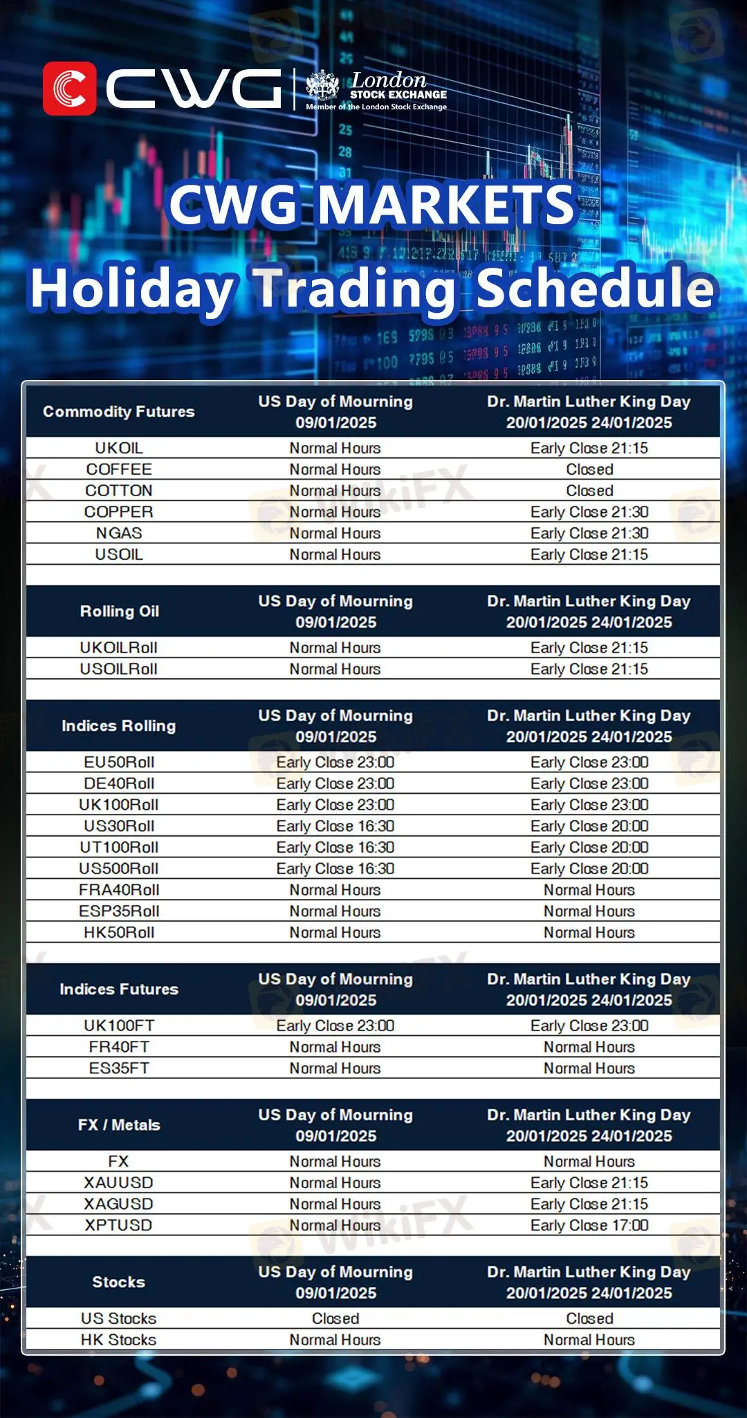 CWG MARKETS - Holiday Trading Schedule