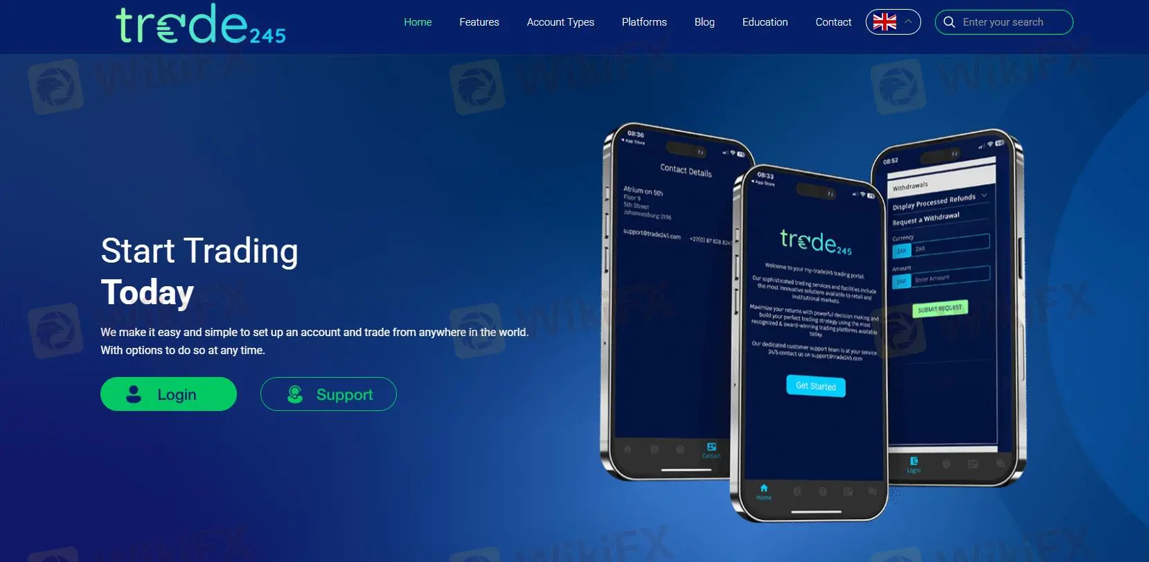 Trade245 is a forex and CFD broker that offers trading services in forex, indices, commodities, and stocks. The broker is registered in South Africa. It offers the popular MetaTrader4 (MT4) and MetaTrader5 (MT5) trading platforms. Trade245 claims to offer competitive spreads, fast execution, and various account types and educational resources for traders.