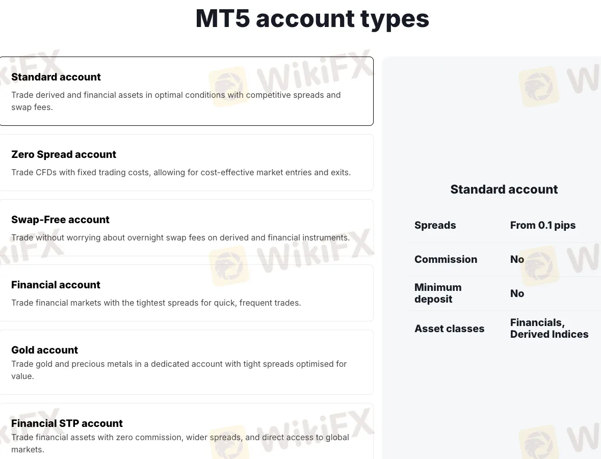 - Deriv MT5 Account: Offers access to financial and derived markets with variable leverage and market depth.