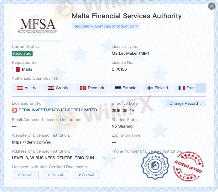 - Malta Financial Services Authority (MFSA): Deriv is fully regulated in Malta under the EU regulations.