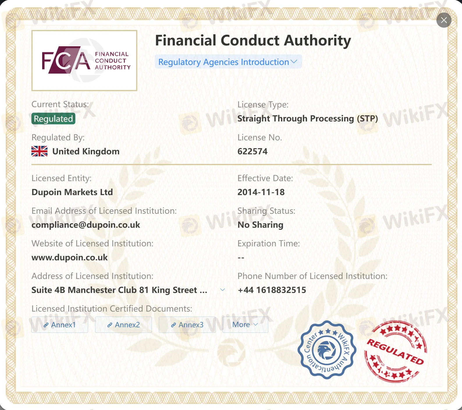 | Financial Conduct Authority (FCA) | United Kingdom | Dupoin UK Ltd | ✅ Regulated | Straight Through Processing (STP) | 622574 |