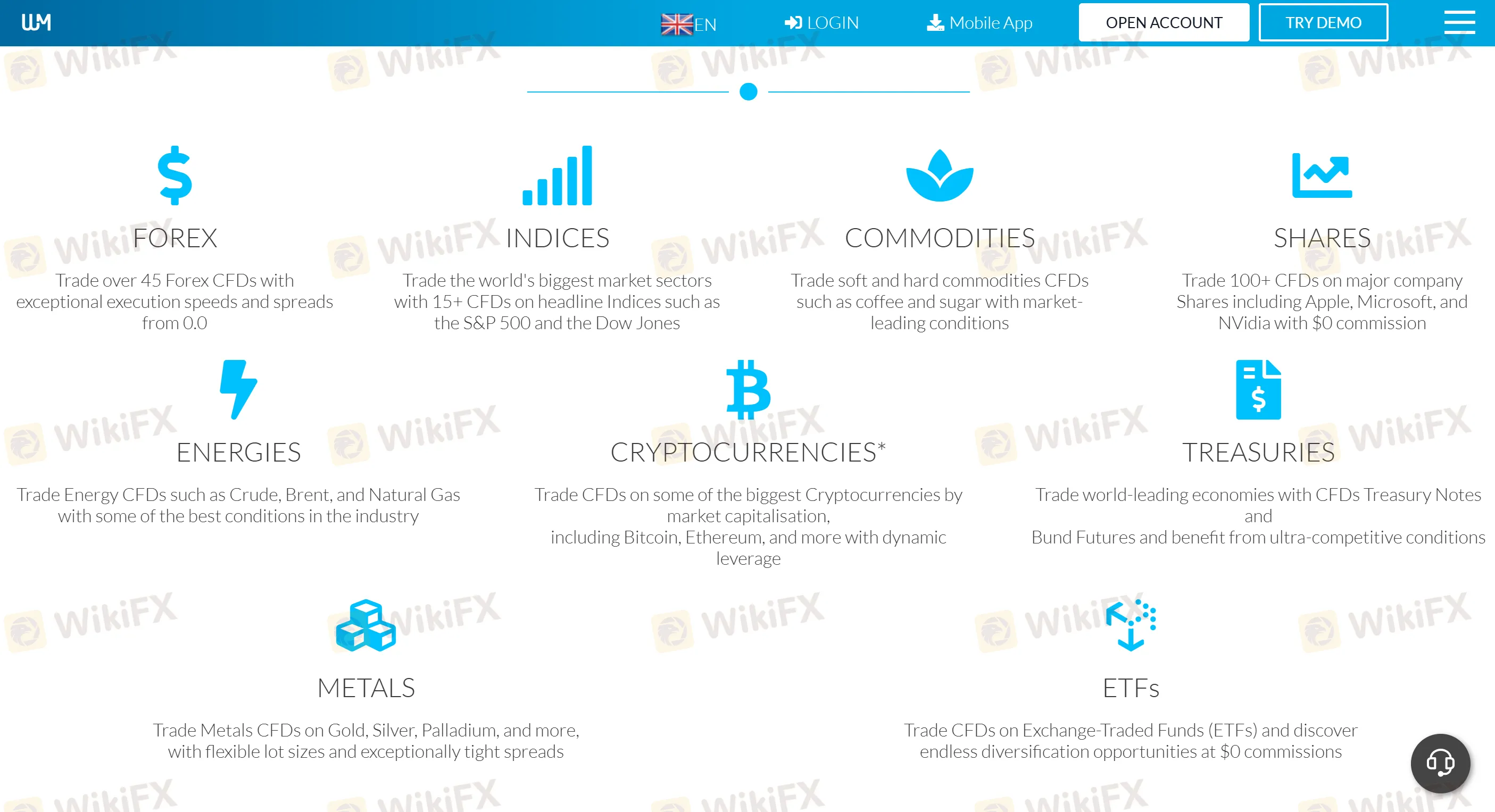 WM Markets offers a globally diversified portfolio of trading markets through CFDs, covering every major asset class. With access to over 45 forex pairs, 100+ stocks, 15+ indices, and additional instruments like metals, commodities, energies, and ETFs, WM Markets empowers traders to seize opportunities across the world's financial hubs. Most products are offered commission-free, and many include tight spreads starting from 0.0 pips and dynamic leverage up to 1:1000.