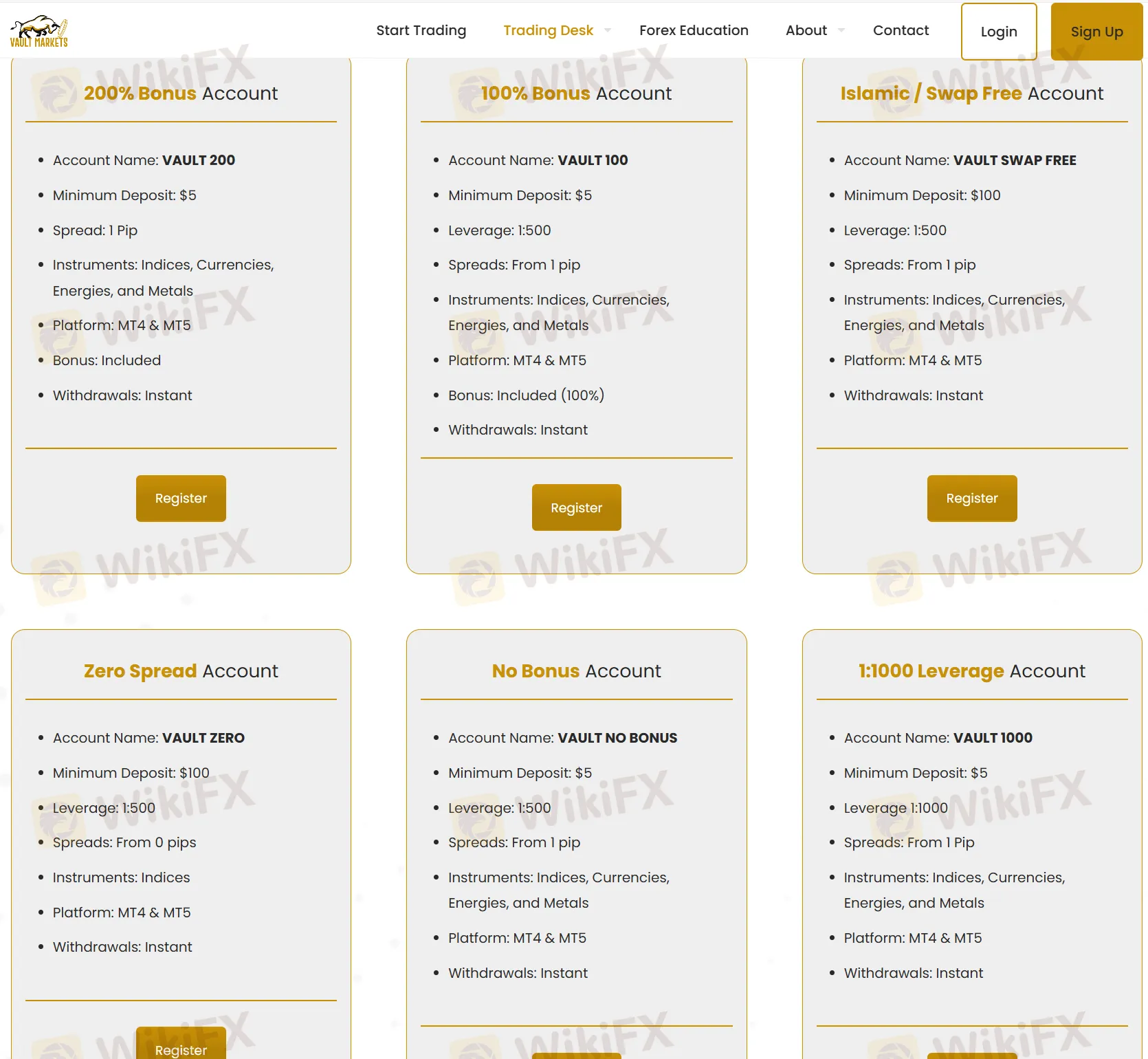 | VAULT NO BONUS | $5 | 1:500 | From 1 pip | Indices, Currencies, Energies, Metals | MT4 & MT5 | None | Instant |