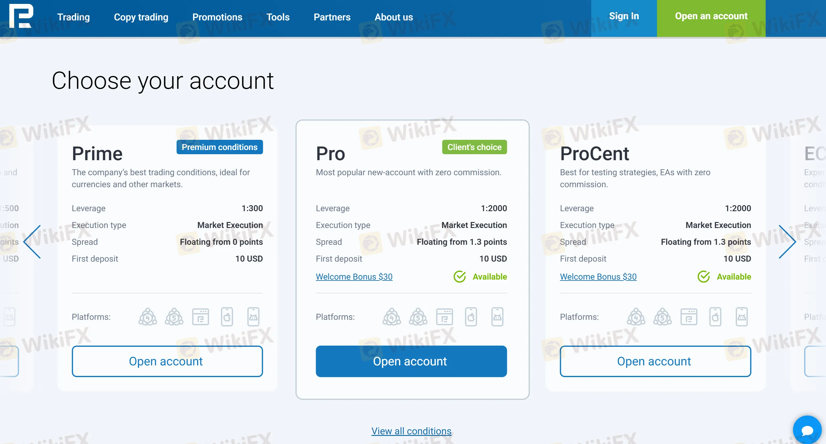 You can open Pro, ProCent, ECN, and Prime accounts on MT4/MT5. Each starts from $10 initial deposit per the platform pages, with floating spreads differing by type and leverage policies that can reach up to 1:2000 on Pro/ProCent under RoboForexs leverage program. ECN/Prime target tighter spreads, often from 0.0 with commission.