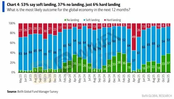 The November Fund Manager Survey (FMS) further reinforces this sentiment. Global cash allocations have fallen to a historical low, declining from 3.8% to 3.7%, reflecting institutional investors growing optimism toward the macro environment.