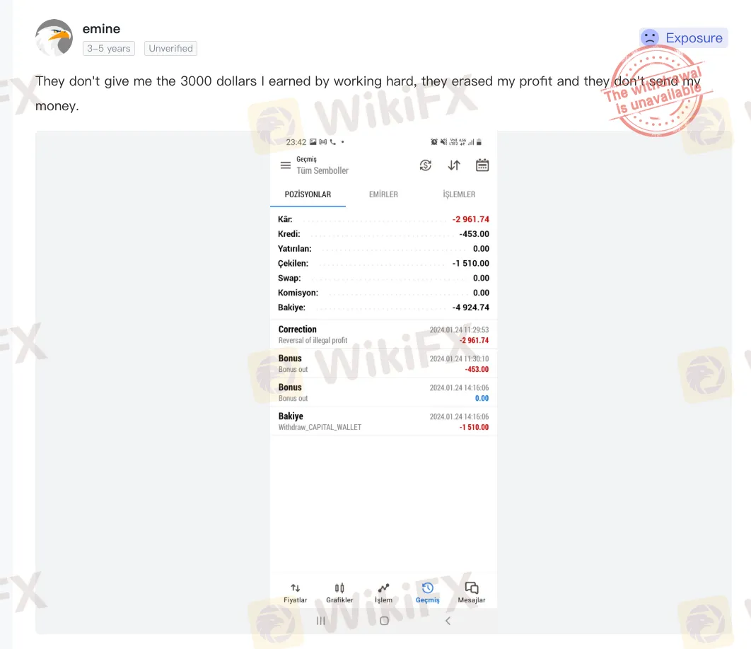 The most concerning pattern involves multiple traders who reported having their profits wiped out after successful trading sessions. Several users shared screenshots showing balance adjustments labeled as “Correction: Reversal of illegal profit” or “Reverse of illegal profit.” In one instance, a trader claimed to have earned approximately $3,000 through hard work, only to see the entire amount deducted and the withdrawal refused.
