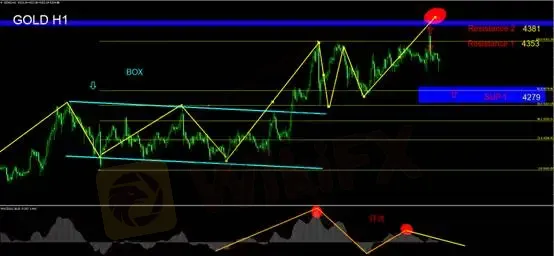 Gold recently posted a new swing high before reversing lower, failing to break above the 4,381 resistance level. On the hourly chart, price action formed a bearish engulfing pattern, signaling a near-term reversal.