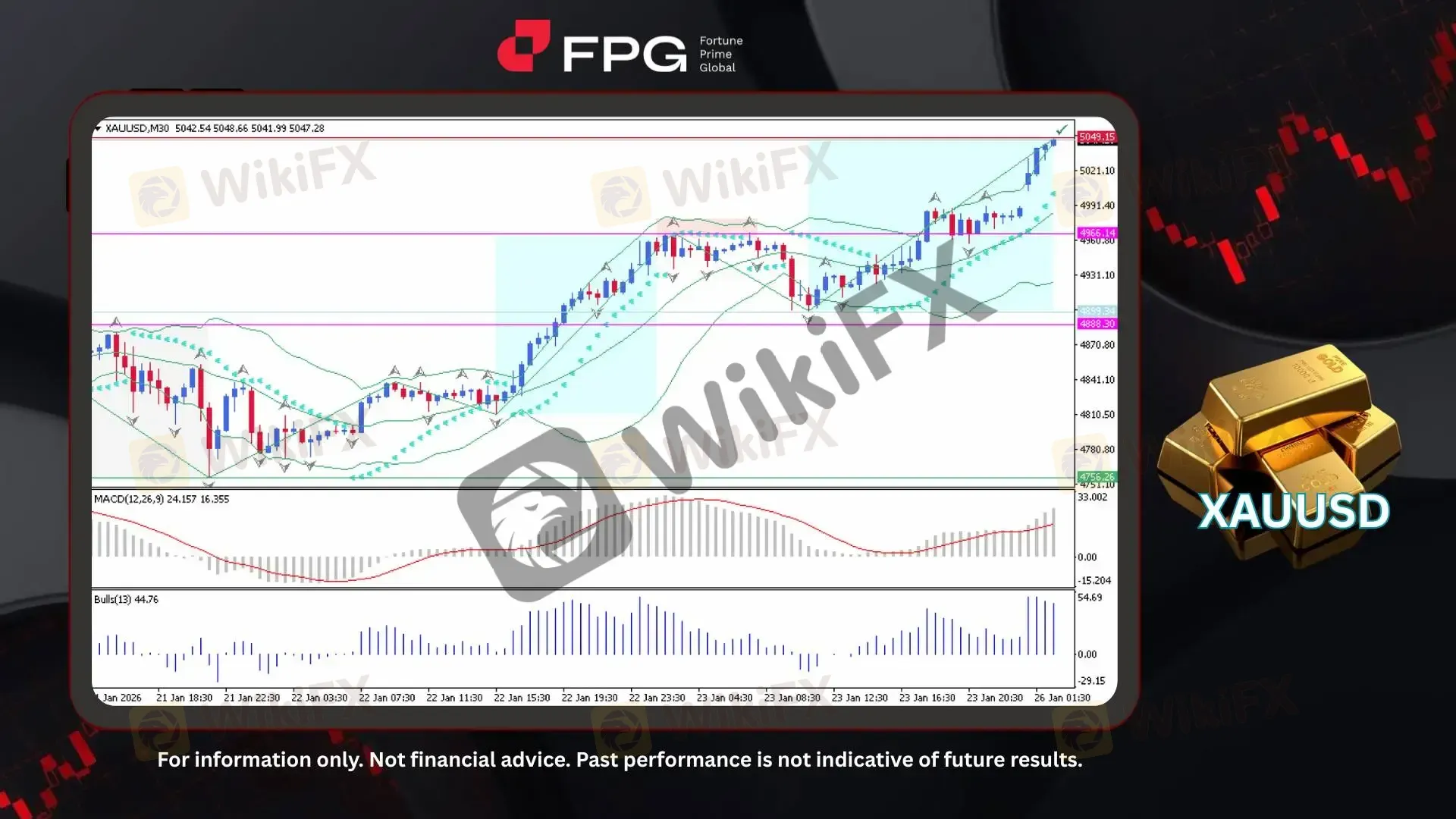 Technically, Gold remains firmly entrenched within a strong bullish structure. Price continues to trade above its rising trend channel and stays close to the upper Bollinger Band, highlighting persistent bullish momentum rather than distribution. The MACD (12,26,9) remains in positive territory, with the histogram expanding again after a brief pullback, signaling renewed upside momentum. At the same time, Bulls Power (13) has climbed to around 44.76, reflecting strong and accelerating buying pressure. Although price is trading at historically extreme levels, there are currently no clear reversal signals on the M30 timeframe, keeping the broader bullish bias intact.