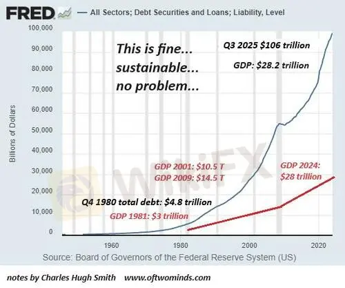 What few seem to understand is 1) the last “real recession” that cleared excesses of debt, leverage and speculation was 1980-82, 45 years ago and 2) the buffers that enabled the eventual recovery back then are gone.Where total debt was low in 1980--about 50% more than GDP--now it's triple GDP. That means “borrowing our way to expansion” isn't possible: borrowers are already unable to service existing debt, never mind more debt.
