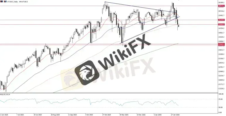 Over on the Nasdaq (UT100), the 25,000 level continues to be a key level to watch. Recent falls have seen the Nasdaq move into a rangebound pattern. Holding above 25,000 would see the index continue in a rangebound state, while a break below would signal the start of a deeper pullback.