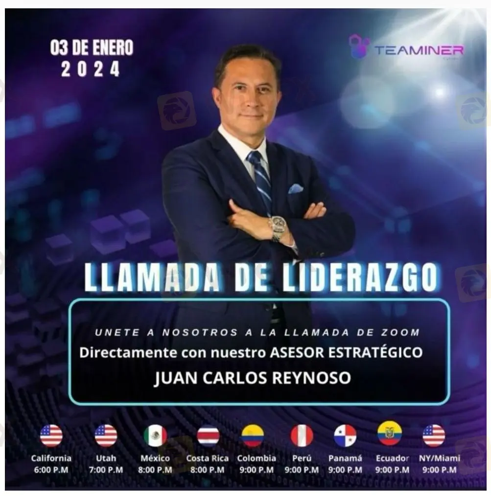 Además de su cargo de asesor estratégico de TEAMINER, Juan Carlos Reynoso promociona activamente a esta compañía a través de sus redes sociales y realiza campañas y llamadas corporativas con el fin de captar nuevos clientes a este sistema MLM.