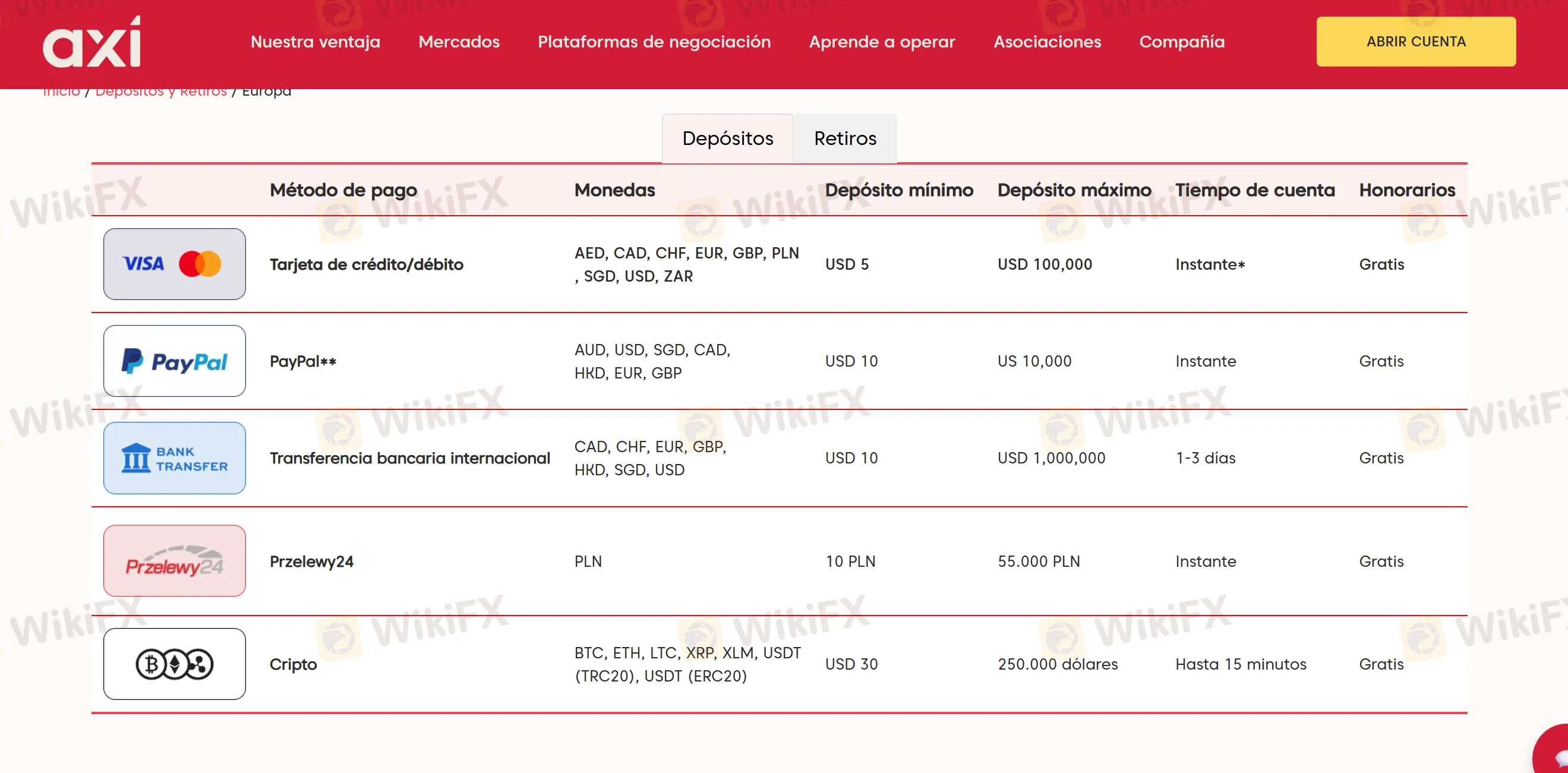 Axi ofrece una amplia gama de métodos de pago para fondeo y retiros, adaptados a cada región (África, Asia, Europa, Latinoamérica, MENA y Norteamérica). Los clientes pueden elegir entre tarjetas de crédito/débito, transferencias bancarias, monederos electrónicos y criptomonedas.