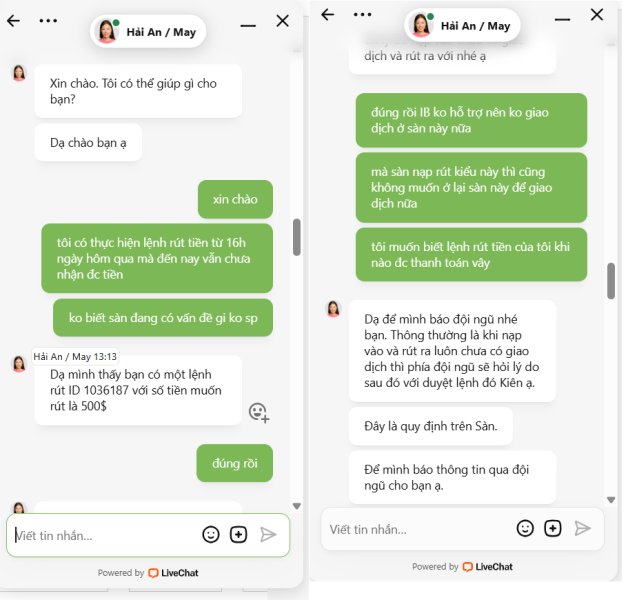 tôi nạp tiền theo 1 IB giới thiệu về sàn này tôi đã nap 500$ vào nhưng do không thấy IB hỗ trợ nên tôi không giao dịch ở sàn này nữa nên đã lập lệnh rút tiền. tôi đã chờ và chat Support rất nhiều lần nhưng vẫn không được giải quyết. Support chat với tôi là người Việt nói chuyện = tiếng Việt rất rõ ràng. tôi thấy sàn này đang có dấu hiệu của lừa đảo nên ACE cần chú ý.