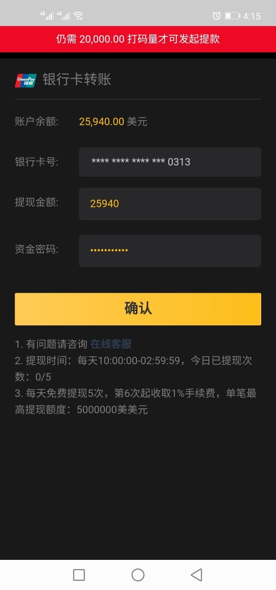 盈利之后无法提现,说是要再入七万一千进去,把方案操作完才可以提现,骗子。