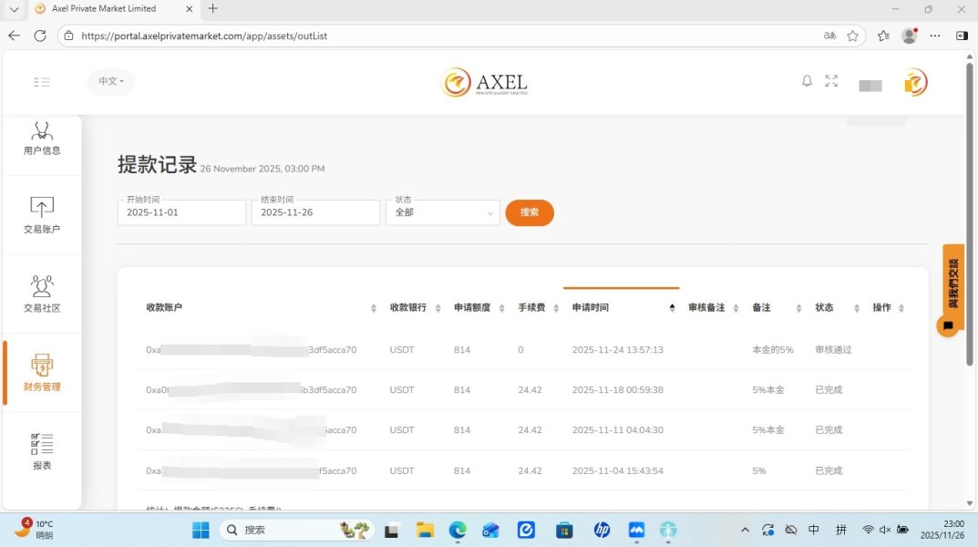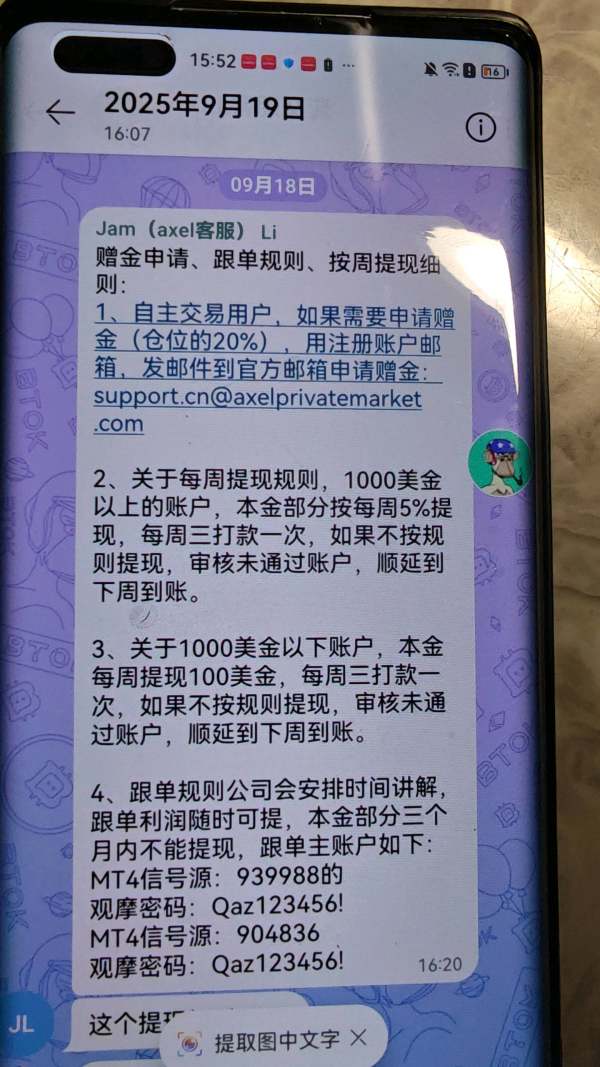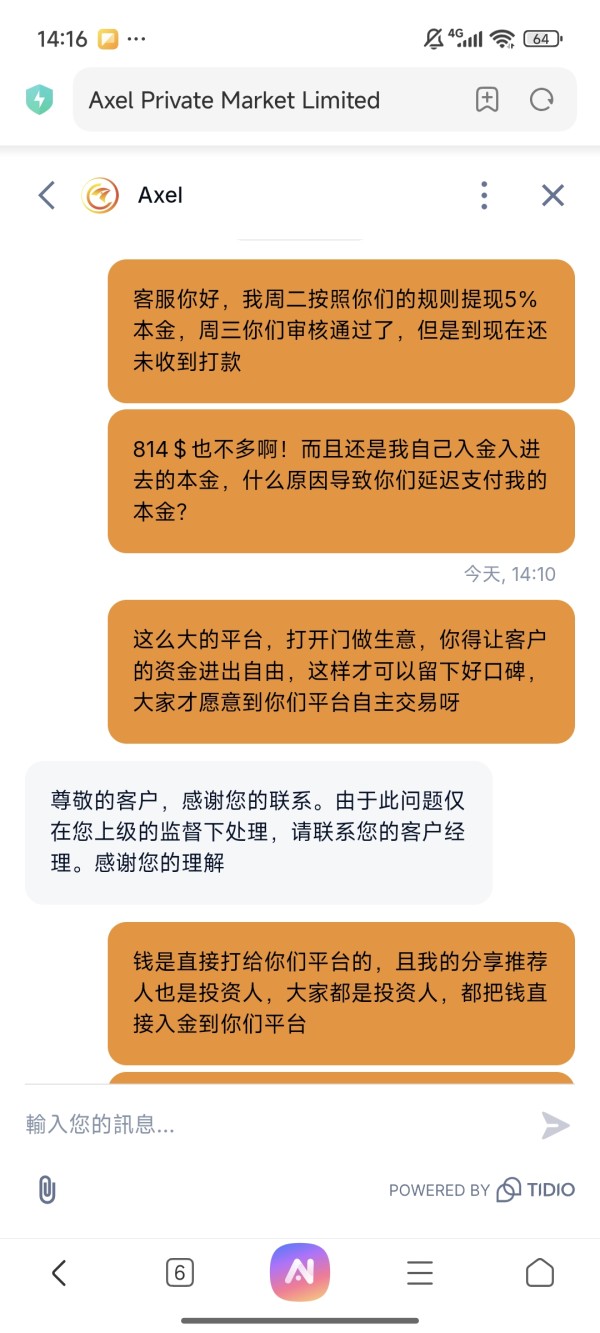 Axel属于黑平台,真金白银入金,阻碍提现本金,之前要求我签署不争议协议,但是不争议协议要求的是全额支付账户本金才不争议,现在无端端又卡着本金不给出!!!!诈骗平台