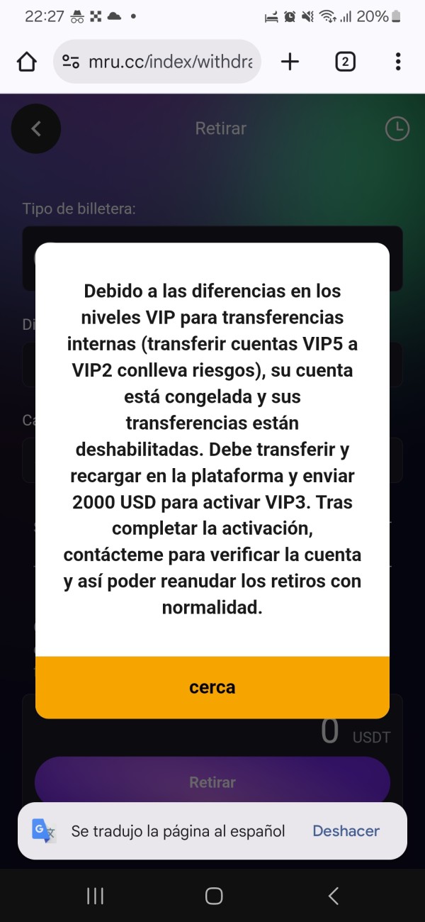 no me deja retirarme dinero me bloquearon la cuenta cuando subí de nivel y me pide q Page otra suscripción