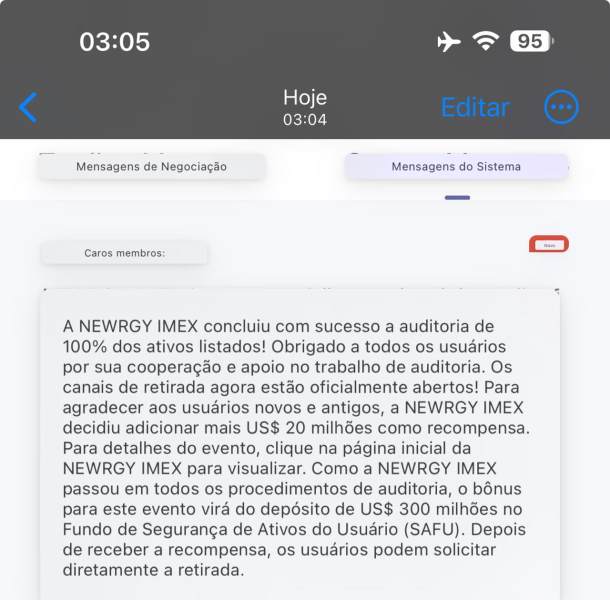 venho aqui parabenizar a grande corretora NEWRGY IMEX pelo sucesso na NYSE Auditoria fui um sucesso listagem ok saque ok venho parabenizar os day trade que sempre confiou nesse período de auditoria parabéns aos líderes pela confiança.