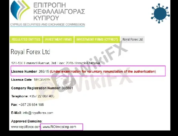 ROinvesting एक निवेश फर्म के रूप में काम करने के लिए CySEC के सीआईएफ लाइसेंस नंबर 269/15 के रूप में पंजीकृत है। CySEC रजिस्टर पर जाँच करते समय, विकीएफएक्स ने पाया कि प्राधिकरण के स्वैच्छिक त्याग के लिए ROinvesting की नियामक स्थिति जांच के अधीन है।