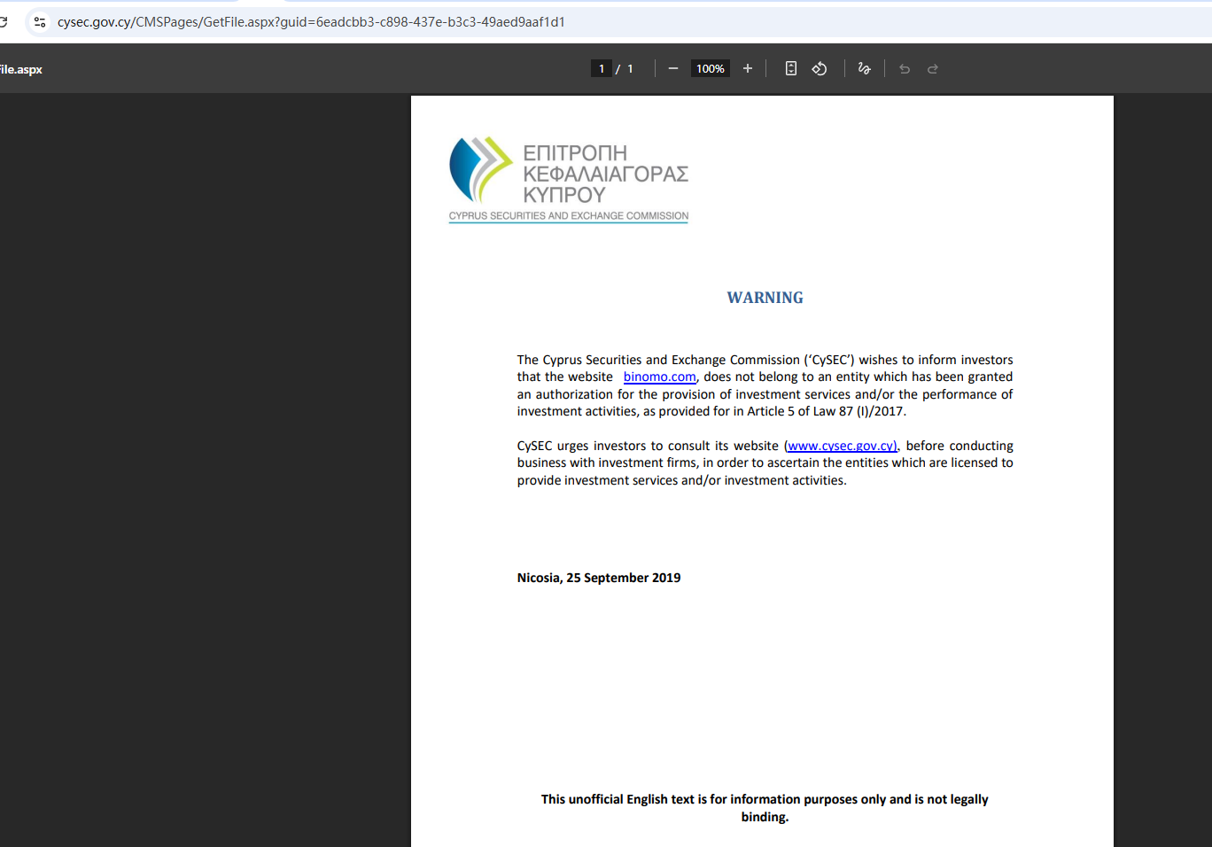 साइप्रस सिक्योरिटीज एंड एक्सचेंज कमीशन ('साइएसईसी') निवेशकों को सूचित करना चाहता है कि वेबसाइट binomo.com किसी ऐसी इकाई से संबंधित नहीं है जिसे निवेश सेवाएं प्रदान करने और/या निवेश गतिविधियों का संचालन करने के लिए कानून 87 (I)/2017 के अनुच्छेद 5 के तहत अधिकृत किया गया हो। साइएसईसी निवेशकों से अनुरोध करता है कि वे निवेश फर्मों के साथ व्यवसाय करने से पहले इसकी वेबसाइट (www.cysec.gov.cy) पर सलाह लें, ताकि यह सुनिश्चित किया जा सके कि कौन सी इकाइयां निवेश सेवाएं और/या निवेश गतिविधियां प्रदान करने के लिए लाइसेंस प्राप्त हैं। निकोसिया, 25 सितंबर 2019.