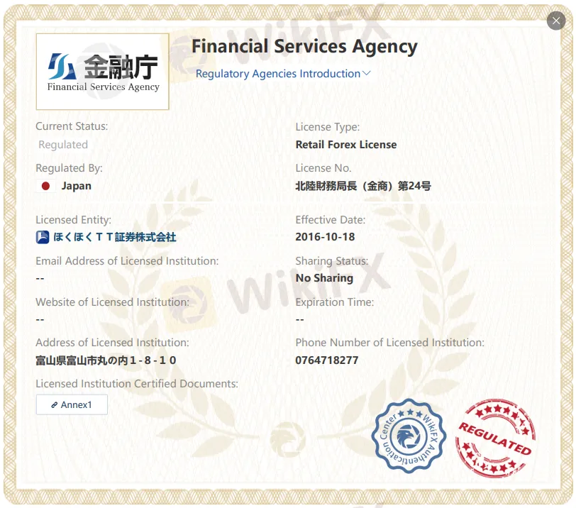 | Jepang | Otoritas Jasa Keuangan (FSA) | Diatur | Hokuhoku TT Securities Co., Ltd. | Lisensi Forex Ritel | Direktur Biro Keuangan Hokuriku (Pedagang Keuangan) No. 24 |
