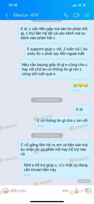 ho effettuato un ordine di prelievo il 08/03/2023, il conto era vuoto, ma il EFX lato ha continuato a detenere i soldi e non ha risposto a e-mail o messaggi tramite la piattaforma whatsapp. hotline fantasma, non posso chiamare. mail che non risponde. chiedi a EFX broker per rimborsarmi.
