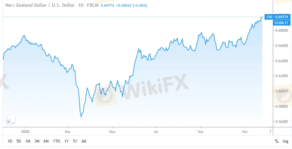 WikiFX Notizie (28 novembre) - Recentemente, la Reserve Bank della Nuova Zelanda ha ridotto la possibilità di implementare tassi di interesse negativi, l'epidemia in Nuova Zelanda è adeguatamente sotto controllo. NZD/USD dovrebbe aumentare per quattro settimane consecutive e il tasso di cambio dovrebbe inaugurare un aumento maggiore nel medio e lungo termine.