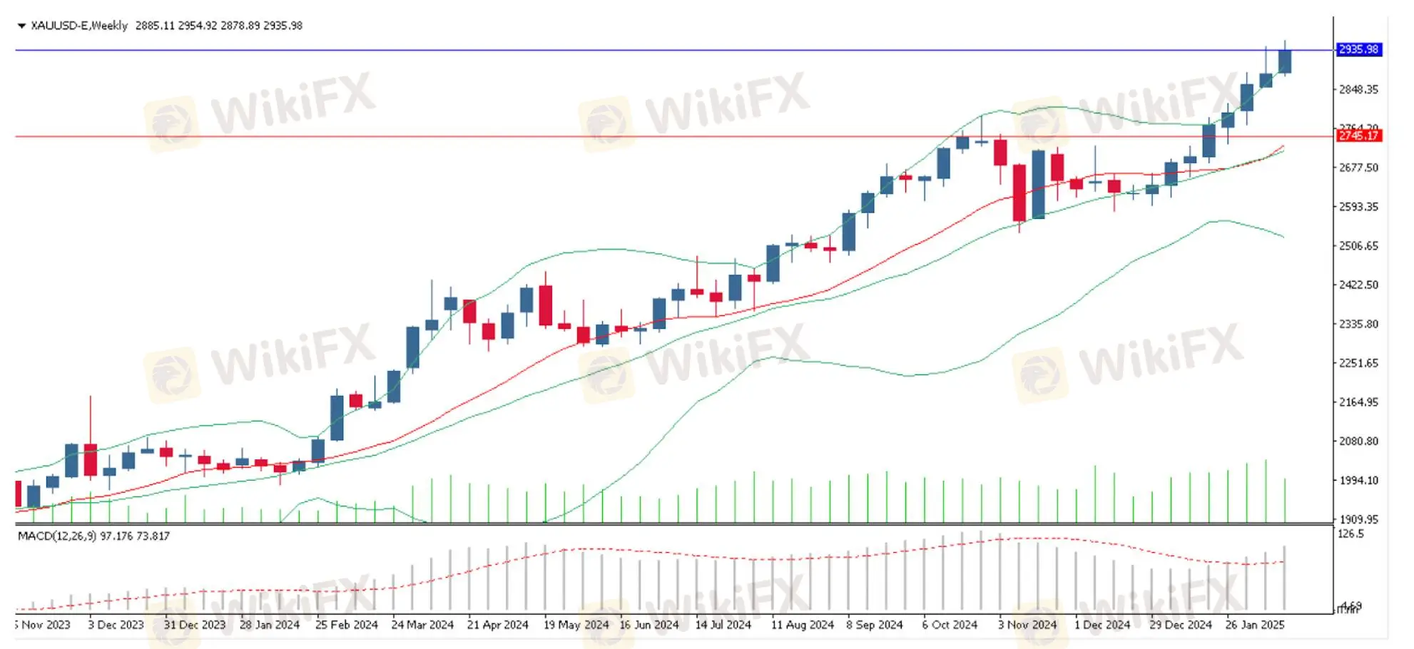 On the weekly timeframe, XAUUSD is traded around $2935.98, continuing its upward trajectory and approaching new resistance levels. The price has decisively broken previous resistance and is now extending gains, supported by strong bullish candlestick formations. Bollinger Bands indicate that gold is trading near the upper boundary, suggesting strong momentum but also the possibility of short-term overbought conditions.