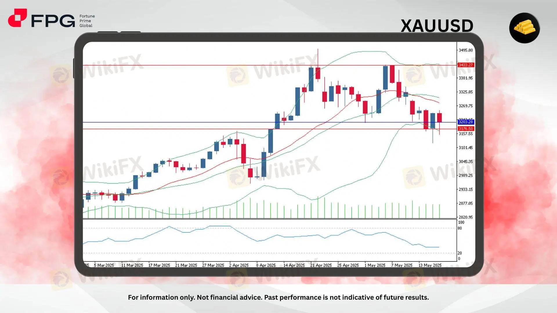Gold (XAUUSD) continues to consolidate in a wide range after a strong bullish rally in April. Currently moving around 3203.28, XAUUSD oscillating just above the support level of 3176.50, suggesting indecision among market participants. Price action is now capped below key moving averages, with bearish momentum slowly increasing.