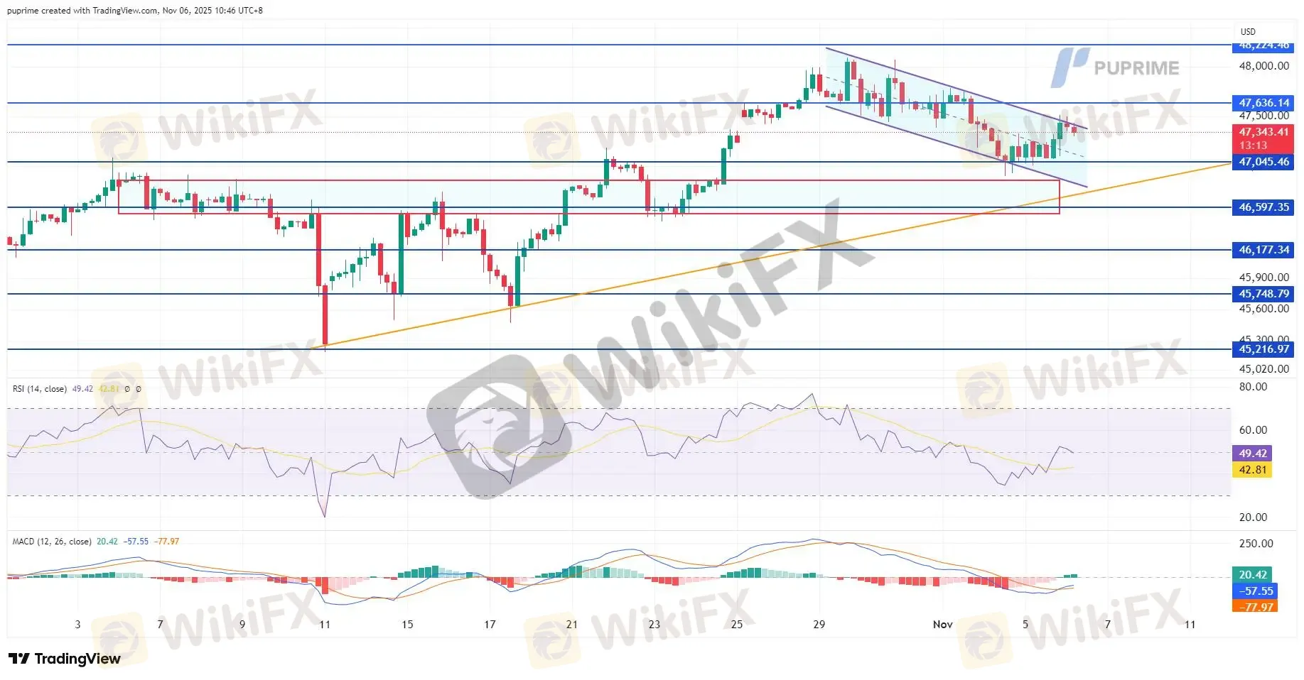 The Dow Jones Industrial Average registered a technical rebound in the previous session; however, the index continues to trade firmly within its defined downtrend channel, confirming the broader bearish trajectory remains unchallenged. The rally lost momentum as prices approached the upper boundary of the descending channel, with a failure to secure a decisive breakout underscoring the persistent dominance of selling pressure.