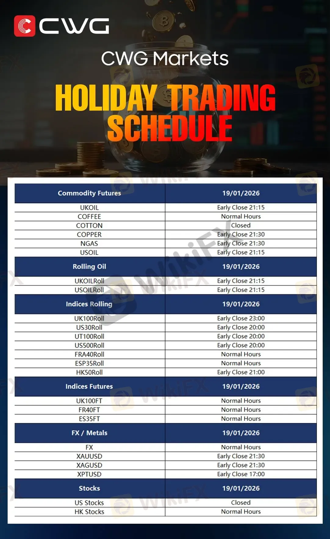 CWG MARKETS - Holiday Trading Schedule