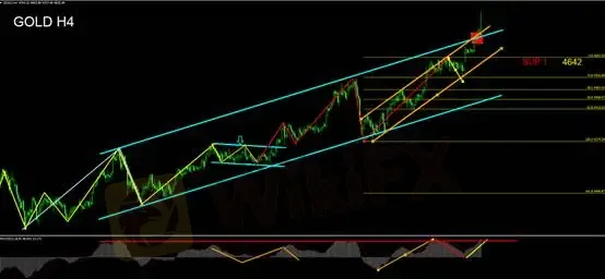 Based on the 4-hour chart, gold has broken above both the medium-term ascending channel (blue) and the short-term ascending channel (orange), entering an overbought zone.