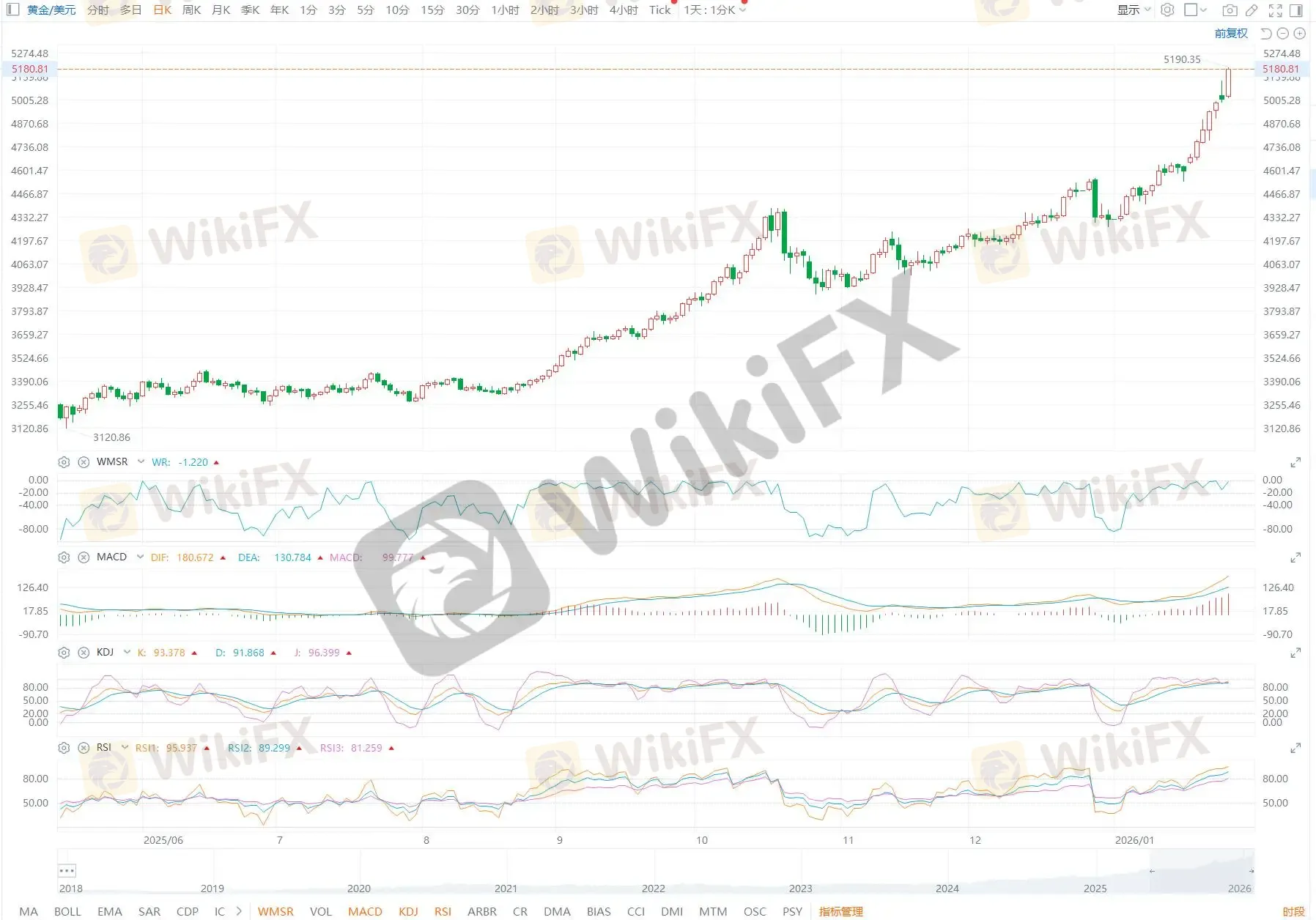 According to ETO Markets monitoring, on January 27 (Tuesday), gold prices surged sharply again. Spot gold jumped USD 173.43 in a single session, up 3.46%, closing at USD 5,181.78 per ounce. Both intraday and closing prices marked new historical highs.