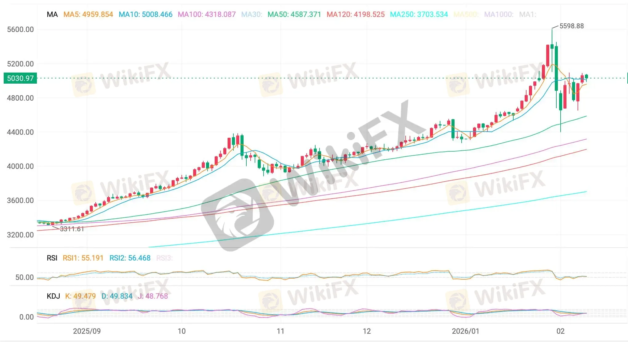 During Asian trading on Feb 10 (Tuesday), price action turned volatile. Gold briefly plunged more than USD 70, dipping toward USD 4,987/oz, before quickly retracing losses. Spot prices later stabilized near USD 5,030/oz, highlighting elevated intraday swings ahead of key data.