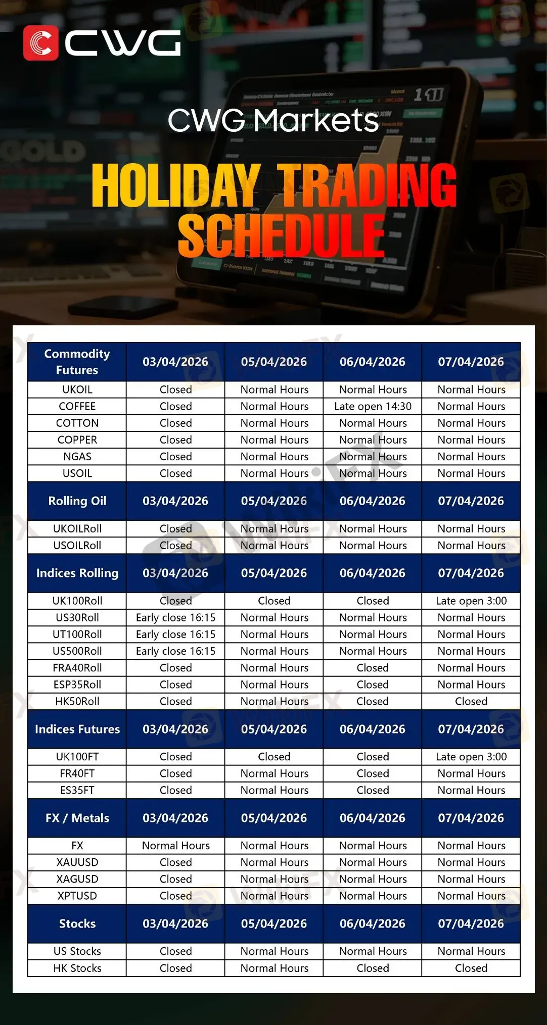 CWG MARKETS - Holiday Trading Schedule