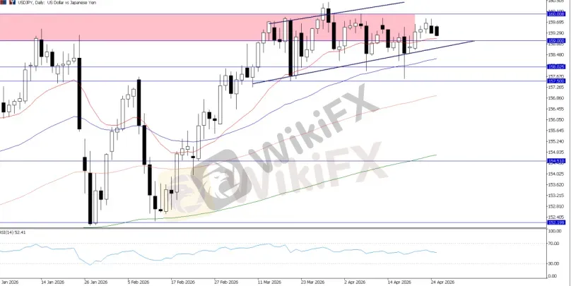 The USDJPY pair remains stuck in a very tight consolidation phase, hovering dangerously near the high side of the 159.00 to 160.00 resistance zone.