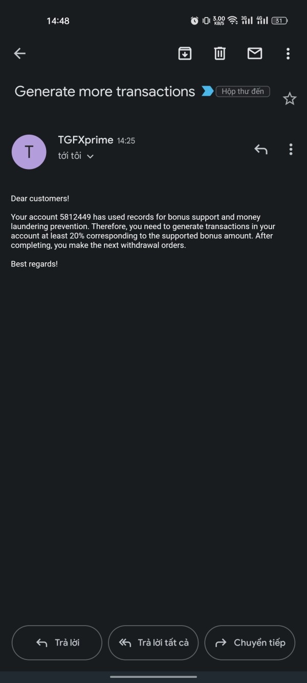 ただし、それに関連していくつかの懸念があります TGFXprime。重大な欠点の 1 つは、有効な規制が存在しないことです。適切な規制なしで事業を運営すると、監視と説明責任が低下するため、投資家やトレーダーが潜在的なリスクにさらされます。さらに、ライセンス番号 0551600 で米国先物協会 (nfa) によって規制されているという主張には疑惑があり、その信頼性に疑問が生じています。口座タイプに関する情報の欠如とデモ口座の欠如により、トレーダーは重要な詳細情報を失い、取引条件をテストする機会が奪われます。さらに、カスタマーサポートについては特に言及されていないため、利用可能なサポートのレベルについては不確実性が残っています。最後に、指定された教育リソースがないため、金融市場での知識とスキルを向上させようとしているトレーダーに対する学習教材やサポートの利用が制限されています。