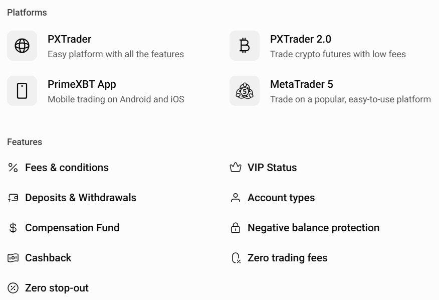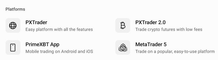 | 取引プラットフォーム | PrimeXBT WebTrader、MetaTrader 5、PrimeXBT アプリ |